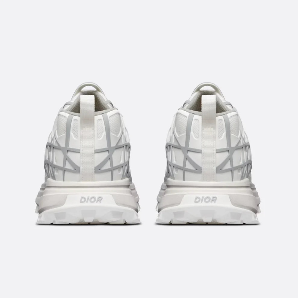 As seen at the Dior Men Summer 2023 fashion show, the season's new low-top B31 Runner shoe is distinguished by its modern silhouette that combines technical expertise with the House's couture spirit. Crafted in white technical mesh, it is enhanced by gray Warped Cannage injected rubber in a futuristic new take on the House's iconic motif. The Dior signature adorns the tongue and front, while eyelets recall a hiking shoe and the CD Diamond drawstring cord accentuate the piece's technical appeal. The thick notched sole in sculpted rubber offers ideal traction, and the reinforced heel guarantees optimal comfort. The B31 Runner sneaker will complete both sportswear and casual outfits alike.