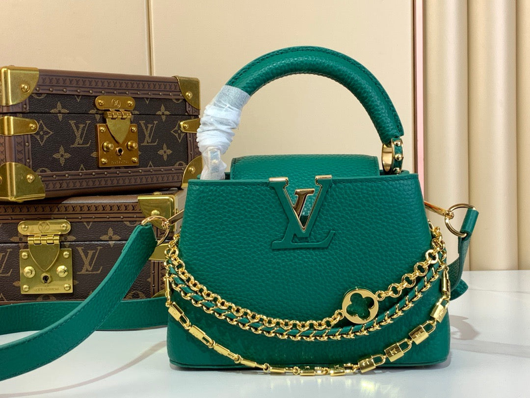 Part of the Trilogy line, this Capucines Mini bag is the epitome of sophistication with its triple chain adornment. Look closely to notice the jewel-like chain details, including signature mini padlocks and enamelled Monogram Flowers. Perfect for evening, this double-carry style is crafted from timeless Taurillon leather and opens to reveal a compartmented interior with a flat pocket for cards.