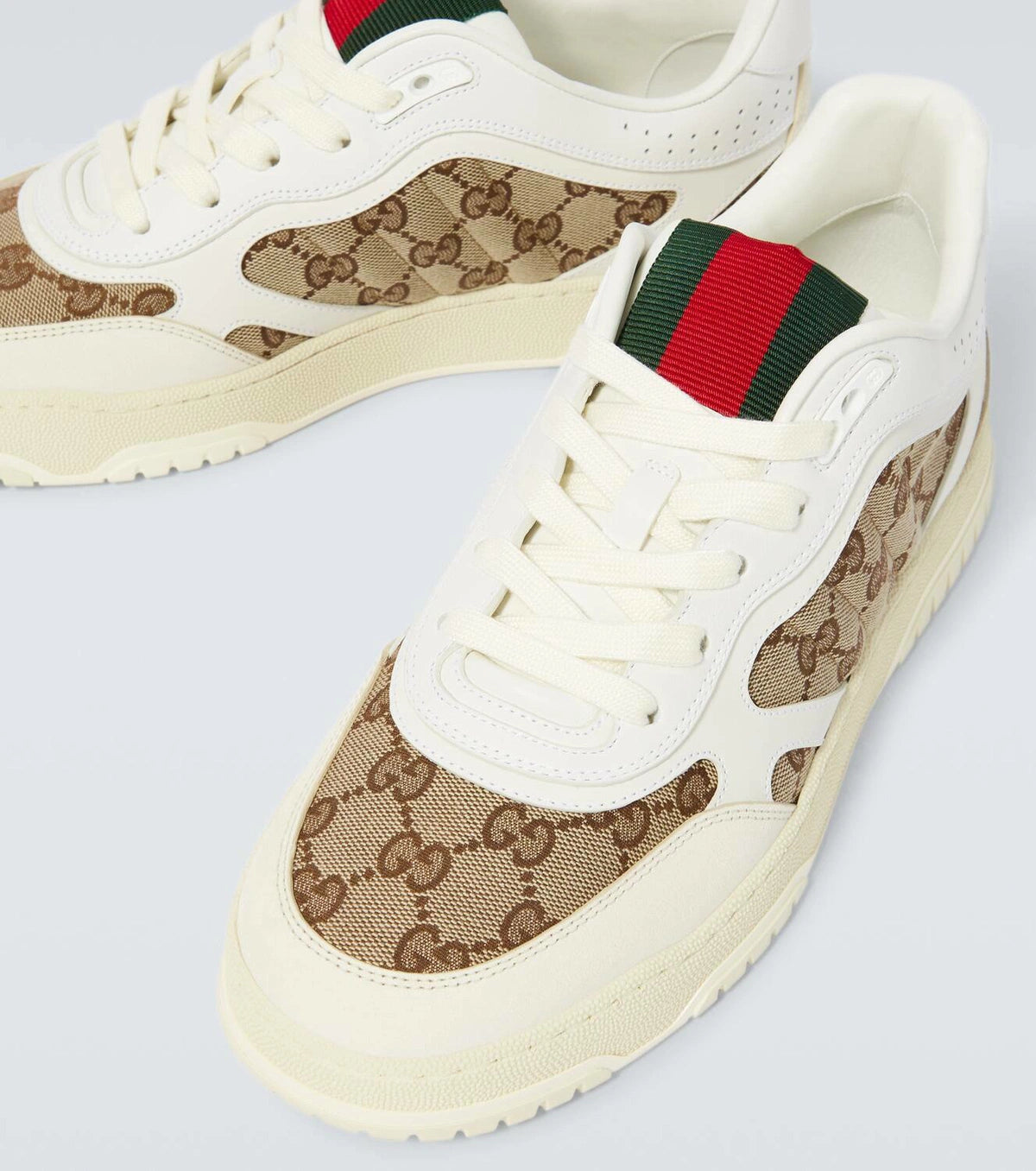 The first sneakers envisioned by Sabato De Sarno for the House, the Re-Web sees heritage stripes as a bold statement detail on a contemporary silhouette. This pair is crafted from the iconic Original canvas and white leather. Defined by multiple iconic details, this new sneaker takes center stage with the bold green and red Web tongue.