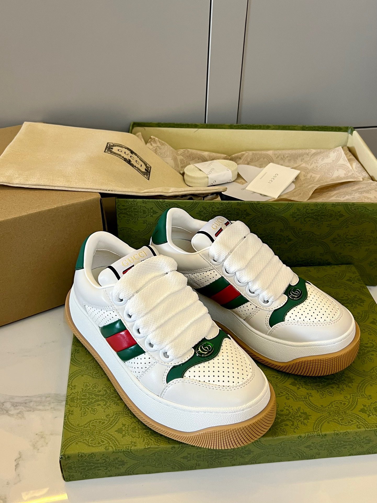Inspired by the summer spirit and beach clubs on the Italian coast, this item is part of Gucci Lido. Influenced by classic trainers from the 1970s, the Screener sneakers is named for the defensive sports move. This variation, in white purple leather is defined by a GG Crystal canvas insert detail.